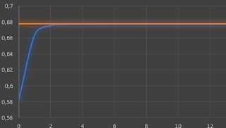 The orange line is equal to 21/31. The blue line shows the odds of winning the roll of, after nth reroll, with 0 being the original (first) roll.